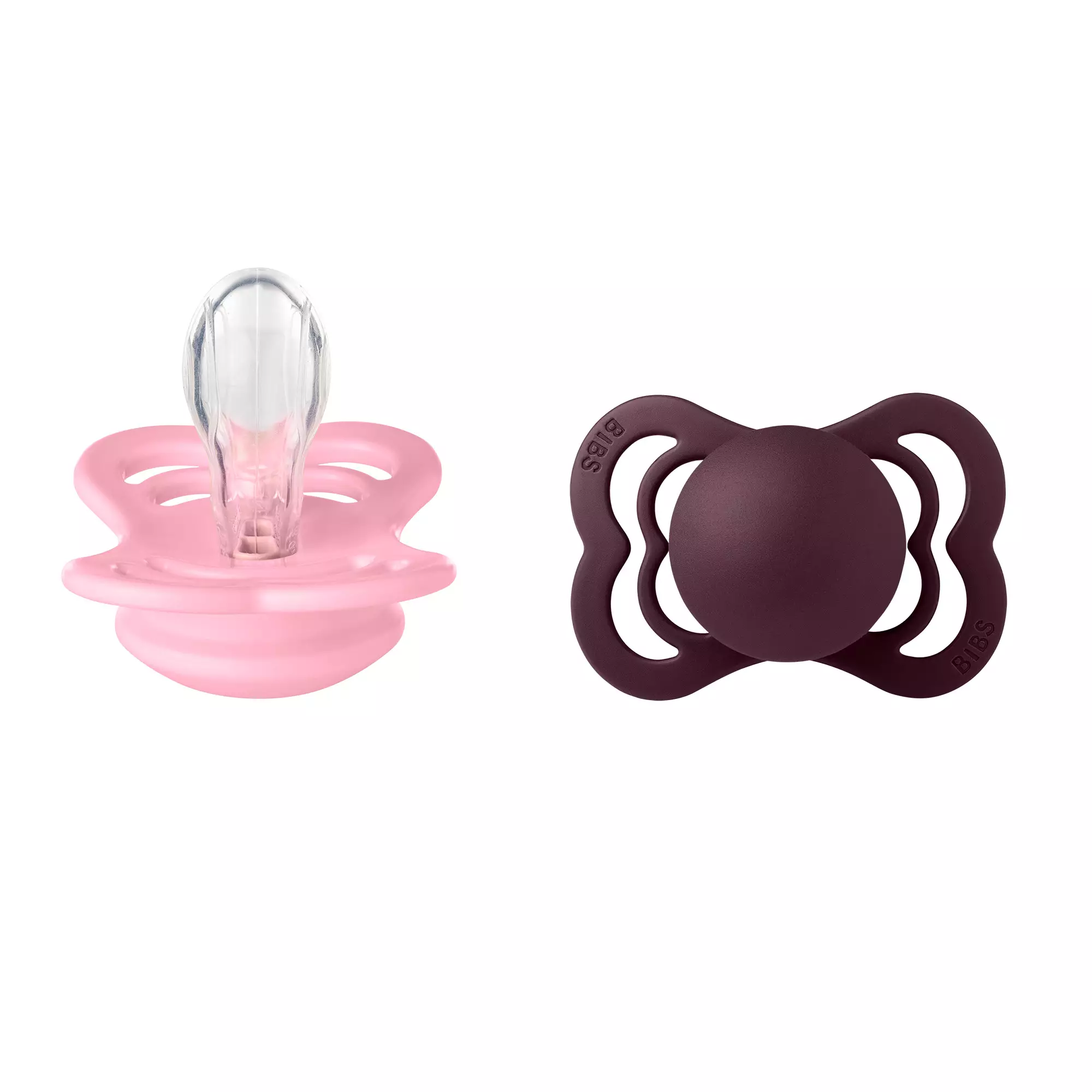 Bibs Supreme silikonitutti 2 kpl 0-6kk, Baby Pink/Plum paketissa on siis kaksi eriväristä tuttia, jotka sopivat vastasyntyneestä noin 6kk ikään asti.
