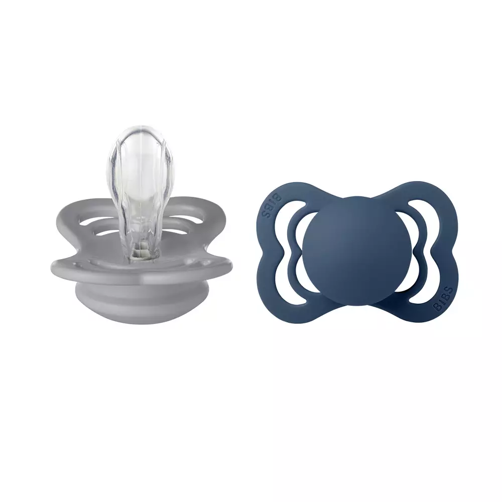 Bibs Supreme silikonitutti 2 kpl 0-6kk, Cloud/Steel Blue -paketissa on siis kaksi eriväristä tuttia, jotka sopivat vastasyntyneestä noin 6kk ikään asti.