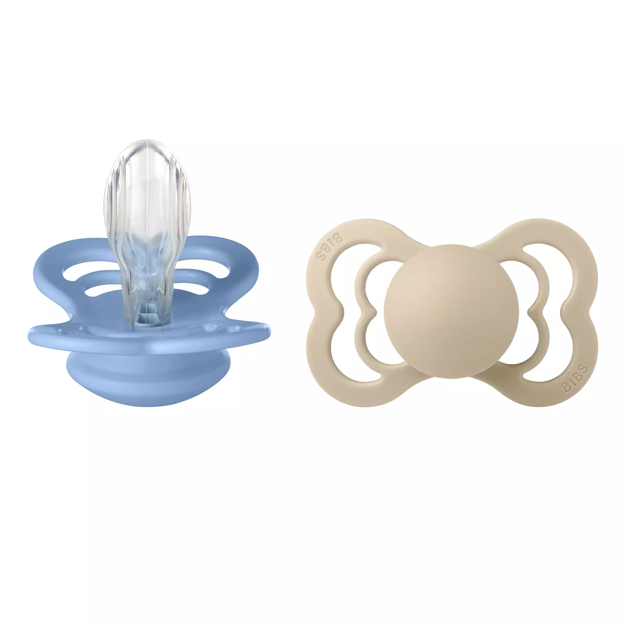 Bibs Supreme silikonitutti 2 kpl 6-18kk, Vanilla/Sky Blue -paketissa on siis kaksi eriväristä tuttia, jotka sopivat puolivuotiaasta noin 18kk ikään asti.