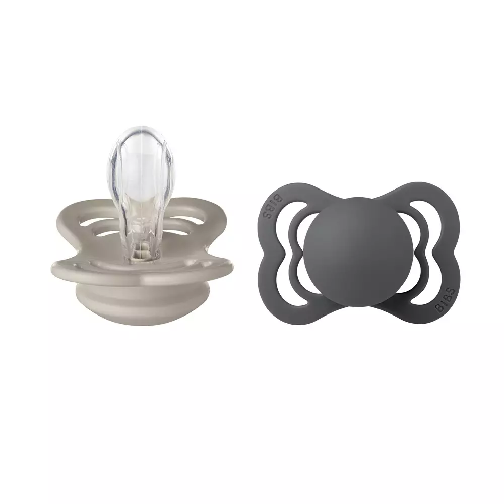 Bibs Supreme silikonitutti 2 kpl 0-6kk, Sand/Iron -paketissa on siis kaksi eriväristä tuttia, jotka sopivat vastasyntyneestä noin 6kk ikään asti.