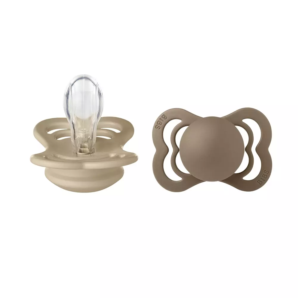 Bibs Supreme silikonitutti 2 kpl 0-6kk, Vanilla/Dark Oak -paketissa on siis kaksi eriväristä tuttia, jotka sopivat vastasyntyneestä noin 6kk ikään asti.