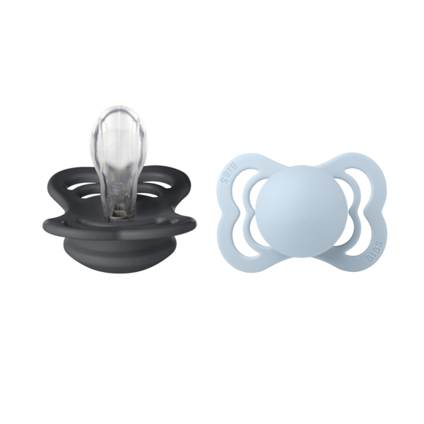 Bibs Supreme silikonitutti 2 kpl 6-18 kk, Iron/BabyBlue- paketissa on siis kaksi eriväristä tuttia, jotka sopivat puolivuotiaasta noin 18kk ikään asti.