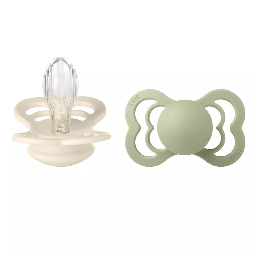 Bibs Supreme silikonitutti 2 kpl 6-18kk, Ivory/Sage -paketissa on siis kaksi eriväristä tuttia, jotka sopivat puolivuotiaasta noin 18kk ikään asti.