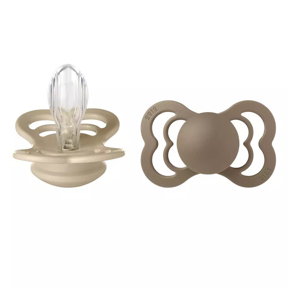 Bibs Supreme silikonitutti 2 kpl 6-18kk, Vanilla/Dark Oak -paketissa on siis kaksi eriväristä tuttia, jotka sopivat puolivuotiaasta noin 18kk ikään asti.