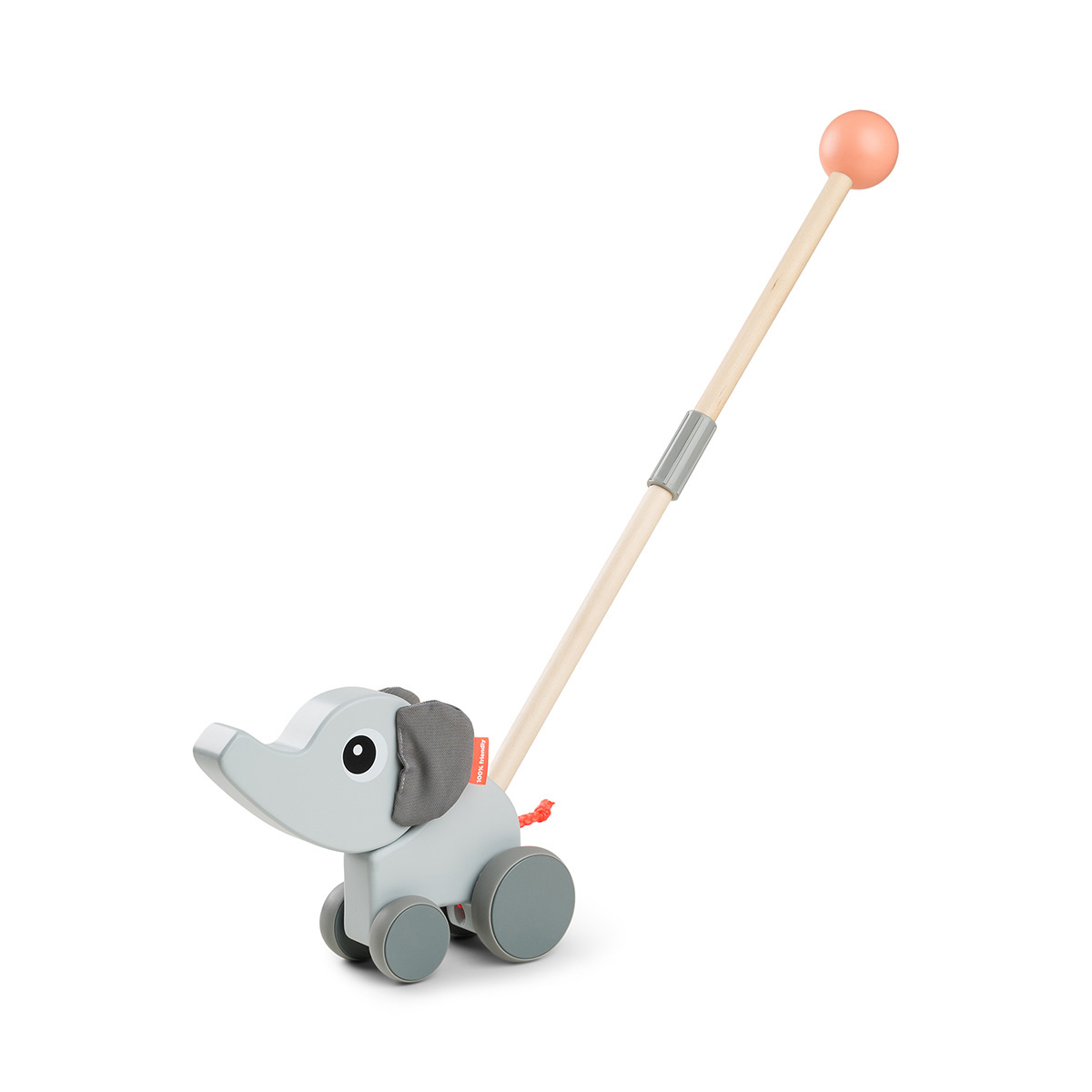 Done By Deer työntölelu Push along Elphee grey on suloinen lelu lapselle, joka osaa jo itse kävellä. Lelu motivoi kävelyä ja mielikuvituksellista leikkiä. Elphee-norsun pää huojuu ja vartalo liikkuu ylös ja alas. Sen korvat ovat tekstiiliä ja niistä kuuluu rypistävää ääntä.