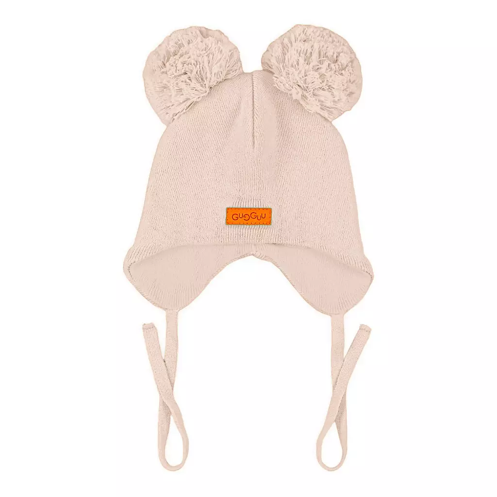 Gugguu vaaleanruskea puuvillapipo lapselle. Pipossa on solmittavat nauhat leuan alla ja pörröiset tupsut päälaella.