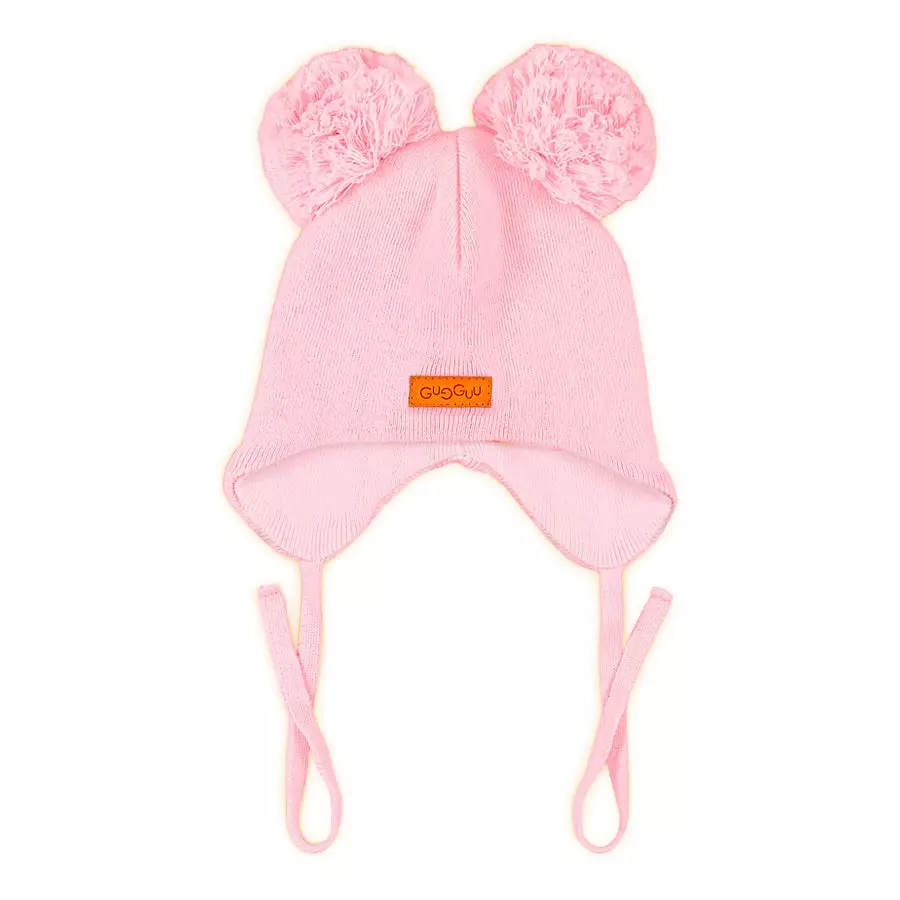 Gugguu vaaleanpunainen puuvillapipo lapselle. Pipossa on solmittavat nauhat leuan alla ja pörröiset tupsut päälaella.