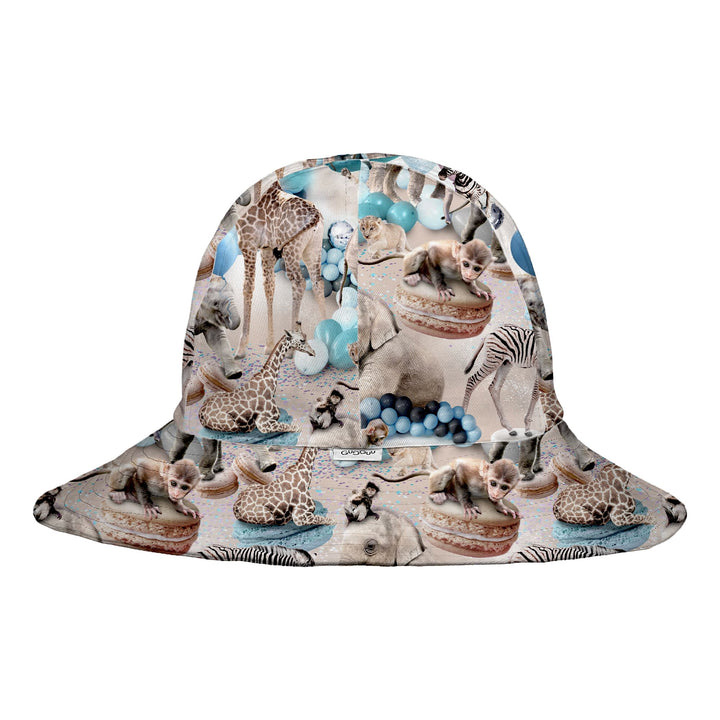 Gugguu Print Kesähattu Balloon safari on ihana hellehattu kesäksi. Lierihatussa on runsas upea Balloon safari -kuosi, jossa on savannin eläimiä ilmapallojen ja macarons-leivoksien keskellä.