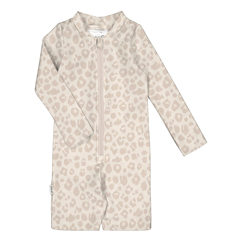 Gugguu UV haalari Sand Leo on pitkähihainen lasten uimapuku shortsilahkeilla. Uimapuvussa on vaaleita leopardin täpliä hiekan värisellä pohjalla.