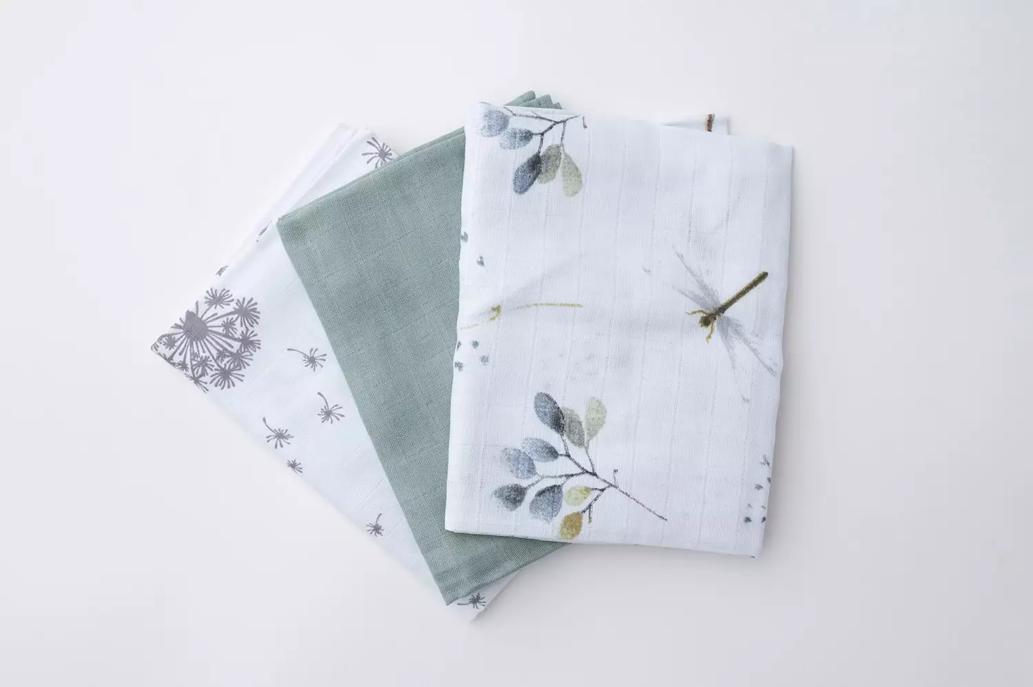 Harsoliinat Lillanel Premium 3-pack vihreä-korento setissä on kolme kaunista harsoliinaa korkealaatuisesta puuvillasta. Erittäin pehmeät harsoliinat ovat monikäyttöisiä vauvan hoidossa. Paketissa kaksi kuvioitua harsoa ja yksi vihreän värinen harso.