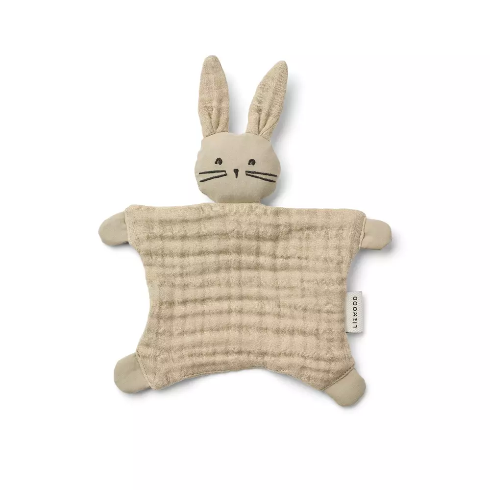 Liewood uniriepu, joka on hempeän värinen ja pupun muotoinen. Pehmoinen uniriepu-unilelu on luomupuuvillaa.