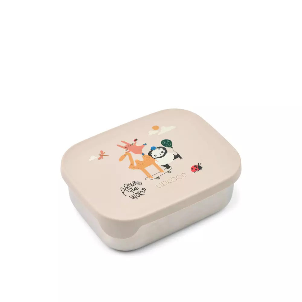 Liewood Arthur eväsrasia Around The World/Sandy on kolmeen osaan jaettu teräksinen eväsrasia silikonisella kannella. Astian kannesta saat erillisen lautasen ruokailuun.