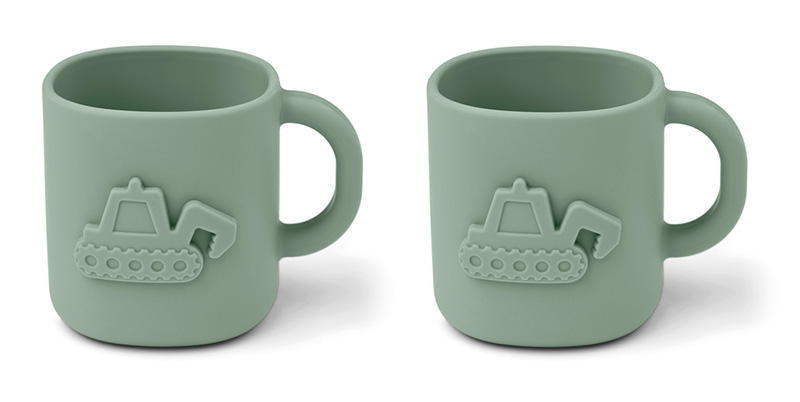 Kahvallinen vihreä Liewood silikonimuki lapselle leikkisällä 3D-kuvalla. Sisältää kaksi mukia.
