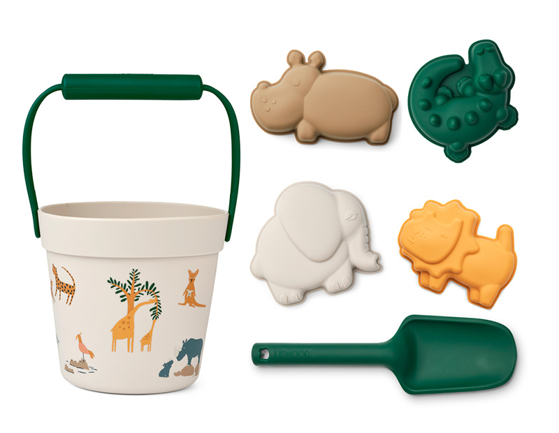 Liewoodin suloinen eläinkuvioinen hiekkalelusetti on loistava valinta mukaan rannalle, puistoon tai vaikka kylpyleikkeihin.