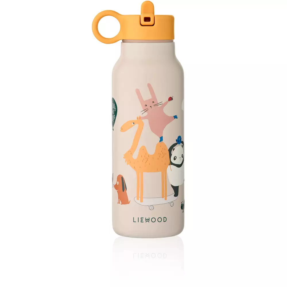 Liewood juomapullo Falk 350 ml Around The World on termospullo, joka pitää juoman lämpimänä tai kylmänä. Erittäin kätevä termospullo kotiin, päiväkotiin tai metsäretkille. Pullossa on kahva, josta saat pullon kiinni reppuun tai vaunuun. Pullossa on esiin käännettävä sporttikorkki.