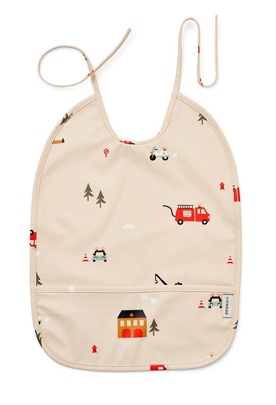 Liewood Lai ruokalappu emergency vehicle/sandy on kaunis ruokalappu, joka suojaa lapsen vaatteita. Ruokalappu on helppo pyyhkiä ja puhdistaa. Ruokalapun tasku kerää tippuvat ruuat talteen.