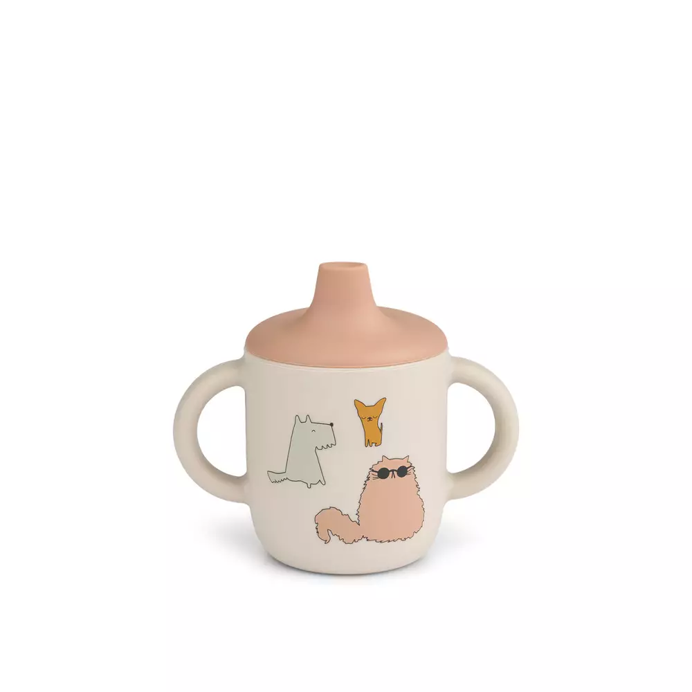 Liewood Neil nokkamuki kahvoilla Cats And Dogs/Sandy on 100% silikonia. Nokkamuki on helppo pitää kädessä ja silikonisen pinnan ansiosta se ei pääse liukumaan pöydän pinnalla. Nokkamukissa on leikkisiä koiran ja kissan kuvia.