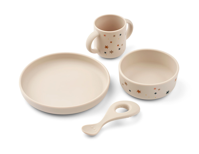 Liewood Vivi ruokailusetti silikonia star bright/sandy on kestävä ruokailuvälinesetti lapselle. Sopii hyvin vaikka lahjaksi! Liewood ruokailusetin mukana tulevat muki, lautanen, kulho ja lusikka. Kaikki ovat 100% silikonia ja turvallisia käyttää.