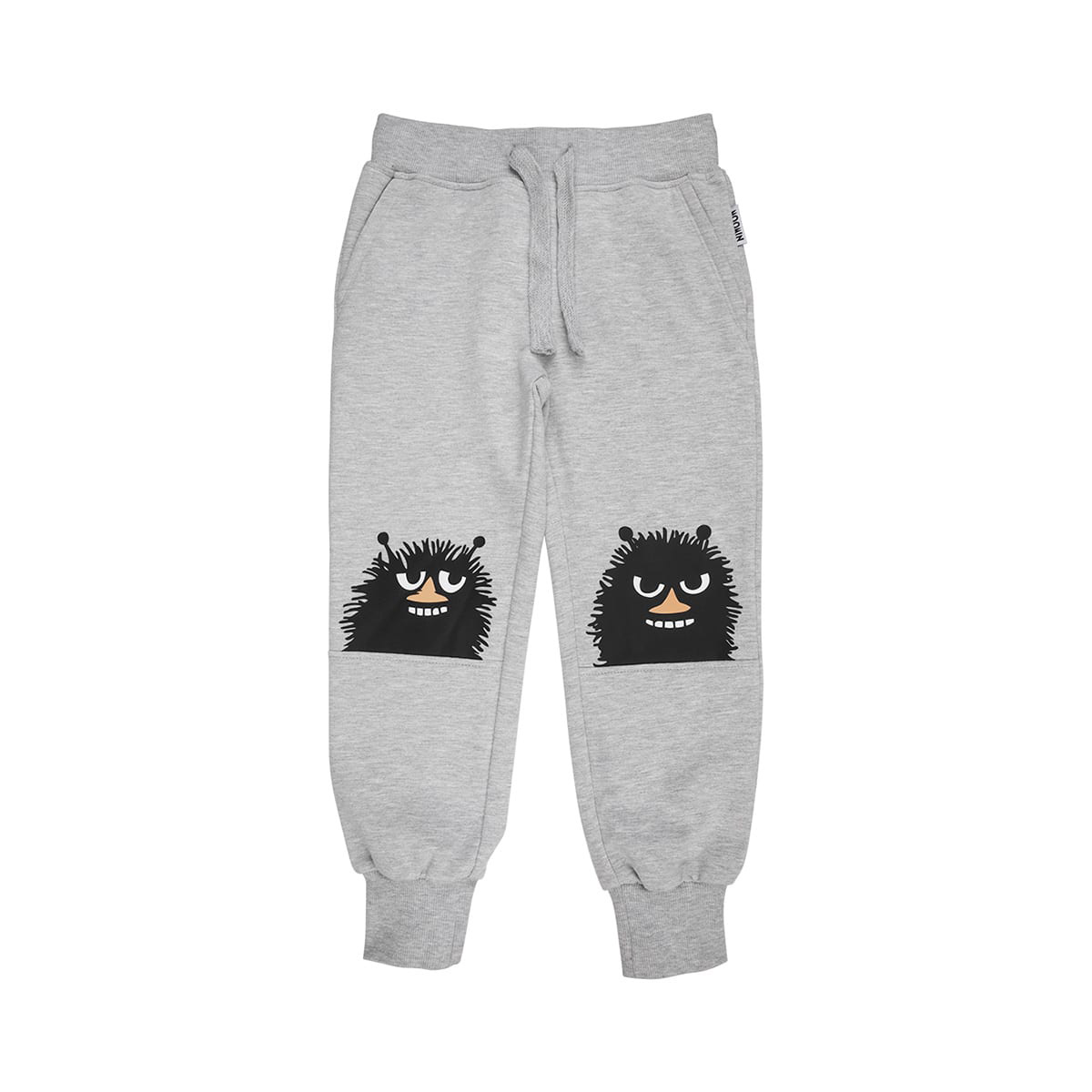 Harmaat Muumi collegehousut, joissa polvissa hauskat kuvat viekkaasta Haisulista.