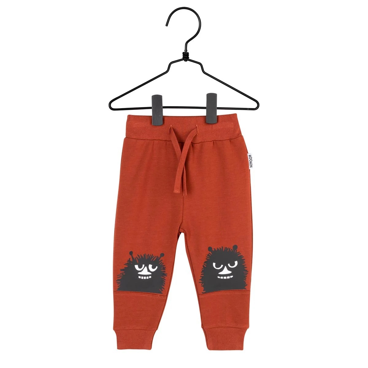 Tummanpunaiset Muumi Haisuli collegehousut lapselle, joissa keppostelevan Haisulin kuva polvissa.