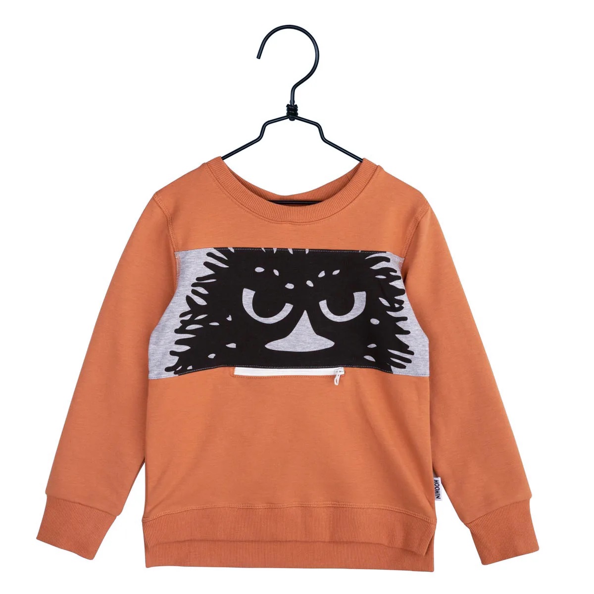 Martinex Haisuli Collegepaita Kellanruskea on pehmeää ja mukavaa joustocollegea. Paidassa on Haisulin kuva, jonka alta aukeaa tasku.