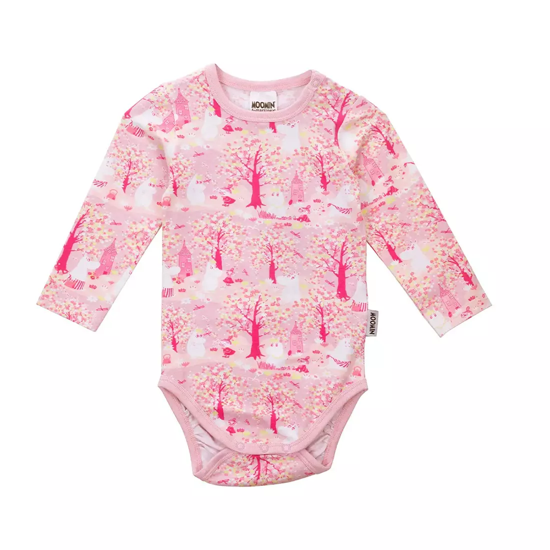 Liila Muumi-body, jossa runsas keväinen Kirsikankukka-kuosi. Luomupuuvillainen pitkähihainen body.