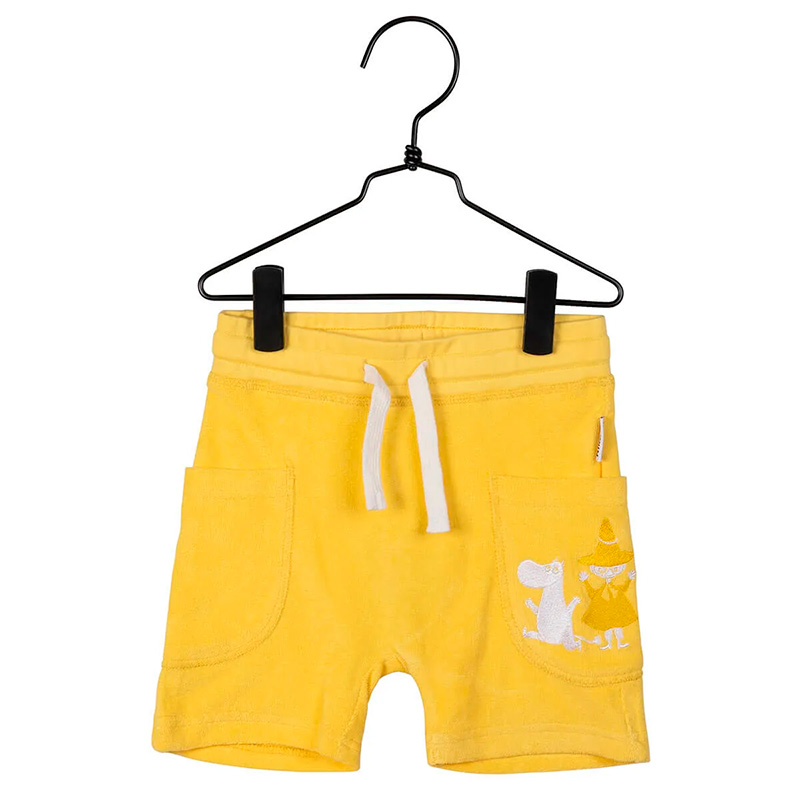 Keltaiset Muumi froteeshortsit lapselle. Mukavan joustavaa ja pehmeää materiaalia.