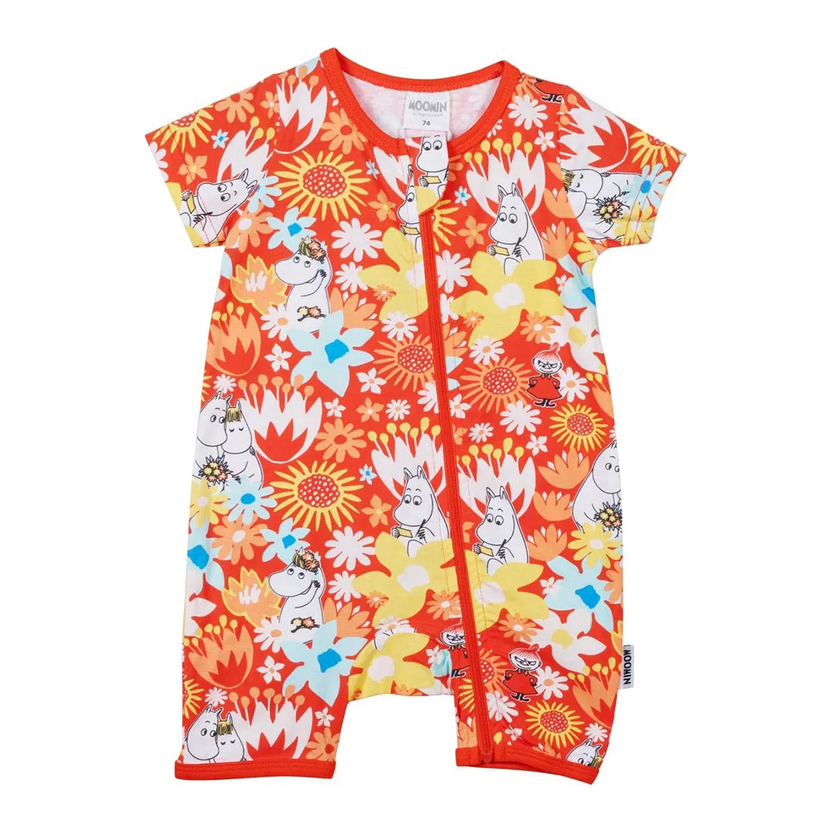 Lyhythihainen Muumi-pyjama kauniilla kukkealla Helle-kuosilla. Pitkä vetoketju avaa yöpuvun kokonaan auki.