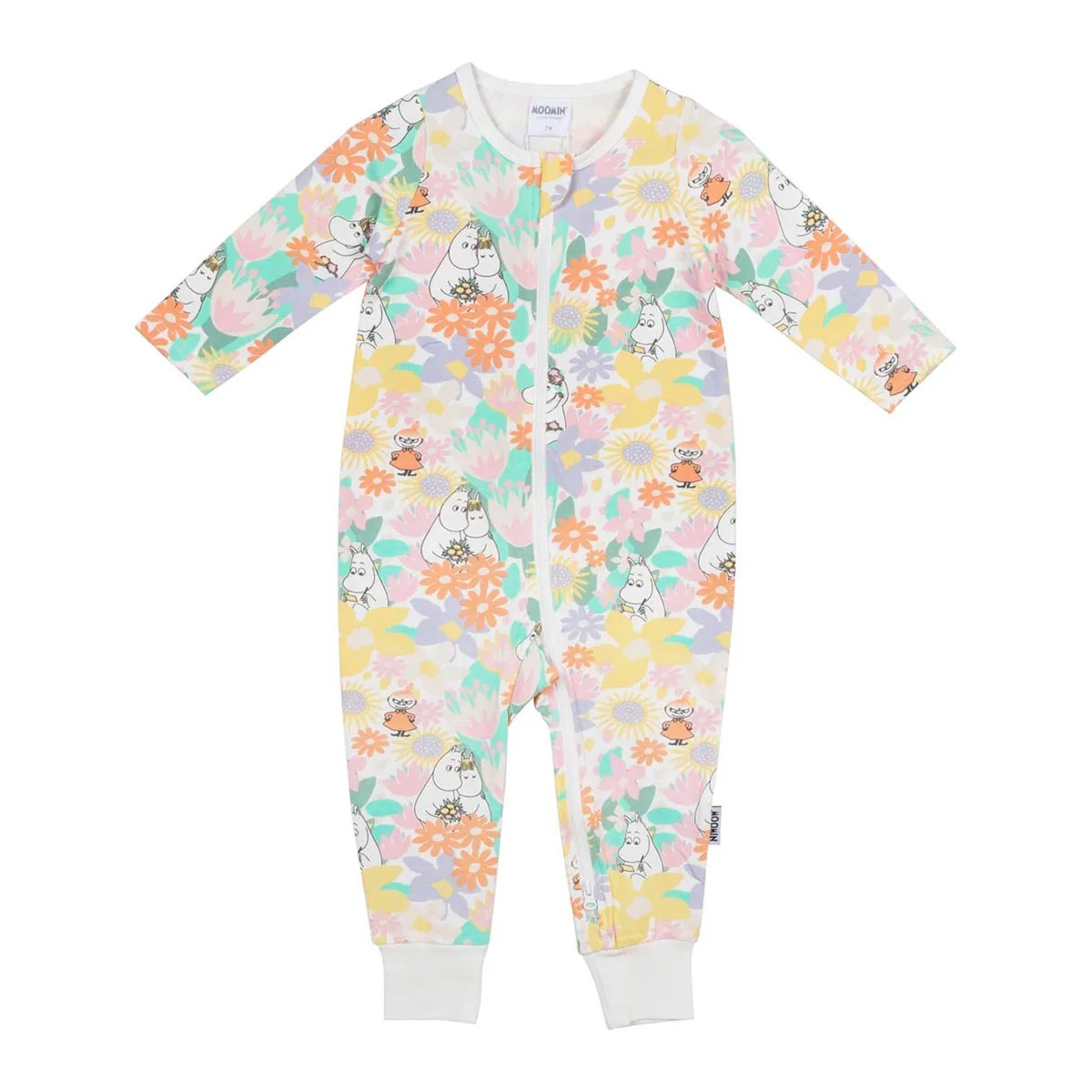 Hempeä kukallinen Muumi-pyjama pitkillä lahkeilla ja hihoilla. Pitkä vetoketju helpottaa pukemista.