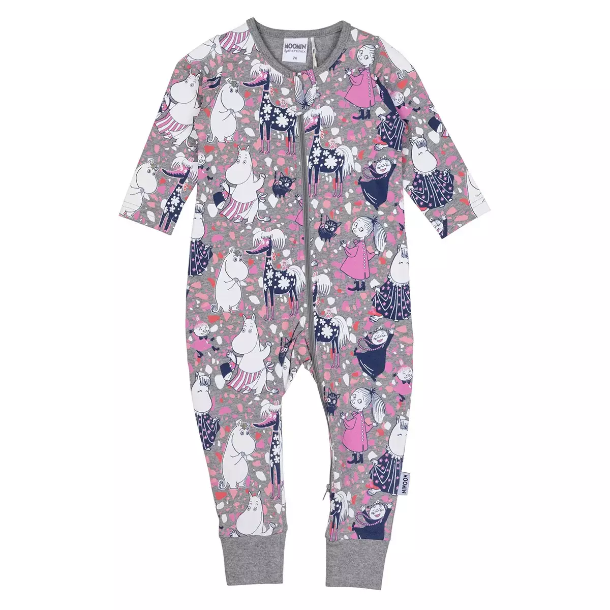 Harmaa Muumi-pyjama pitkillä lahkeilla ja hihoilla. Pitkä vetoketju helpottaa pukemista.