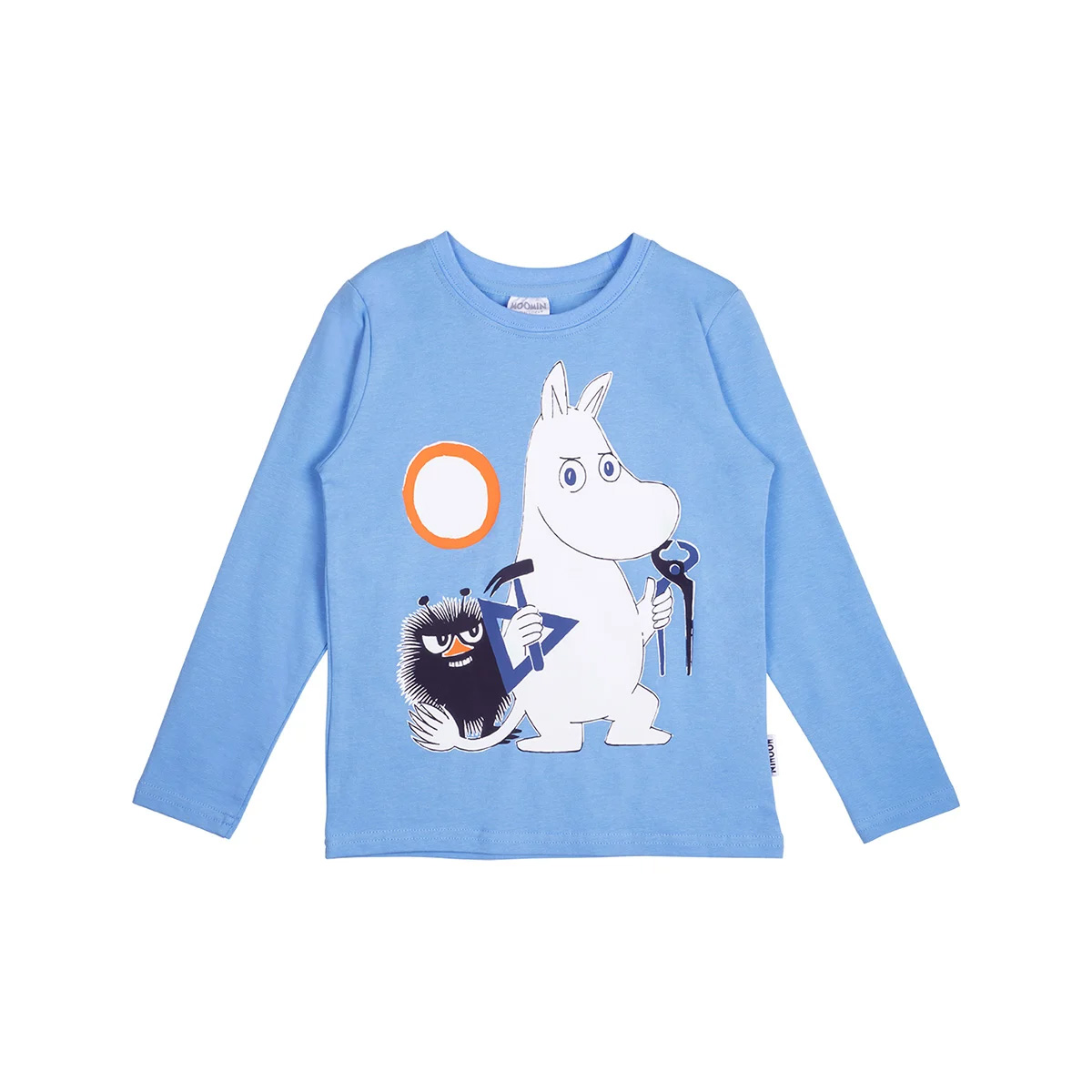 Vaaleansininen pitkähihainen paita Muumipeikon ja Haisulin kuvalla, joka on valmistettu pehmeästä luomupuuvillatrikoosta.