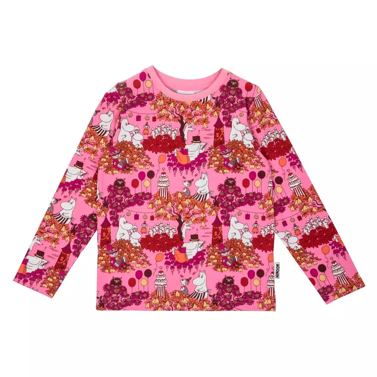 Pinkki pitkähihainen Muumi paita, joka on valmistettu pehmeästä luomupuuvillatrikoosta.