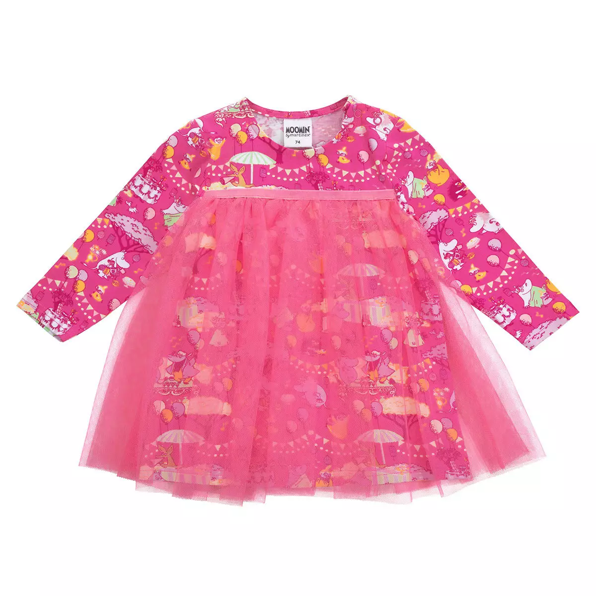 Martinex Muumi Juhlia Tyllimekko pinkki, on ihastuttava mekko pitkillä hihoilla, jossa samettinauha sekä pehmeästi laskeutuva tyllihelma. Yläosassa on ihastuttava Juhlia-kuosi, jossa koko Muumilaakson väki juhlii riemukkaasti yhdessä.