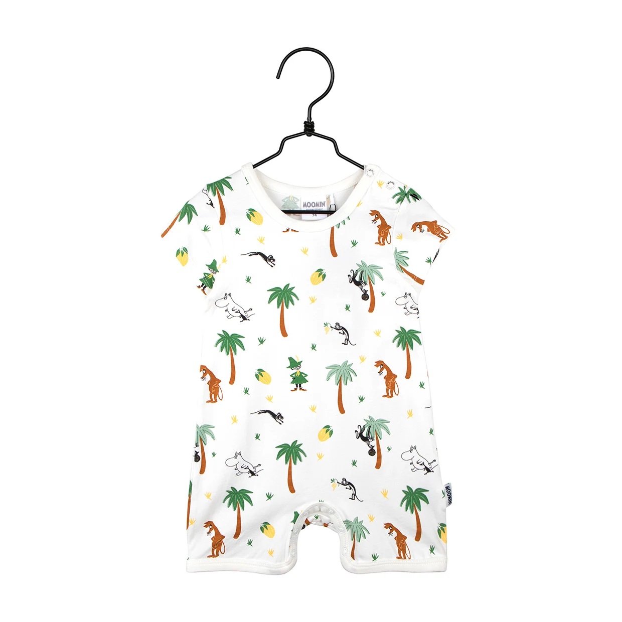 Valkoinen leikkipuku, jossa on lyhyet hihat ja lahkeet. Muumi jumpsuit, jossa Kangastus-kuosi.