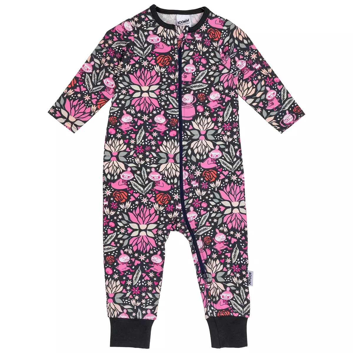 Muumi-pyjama pitkillä lahkeilla ja hihoilla. Pitkä vetoketju helpottaa pukemista. Yöasussa on runsas ja koristeellinen kukka-kuosi.