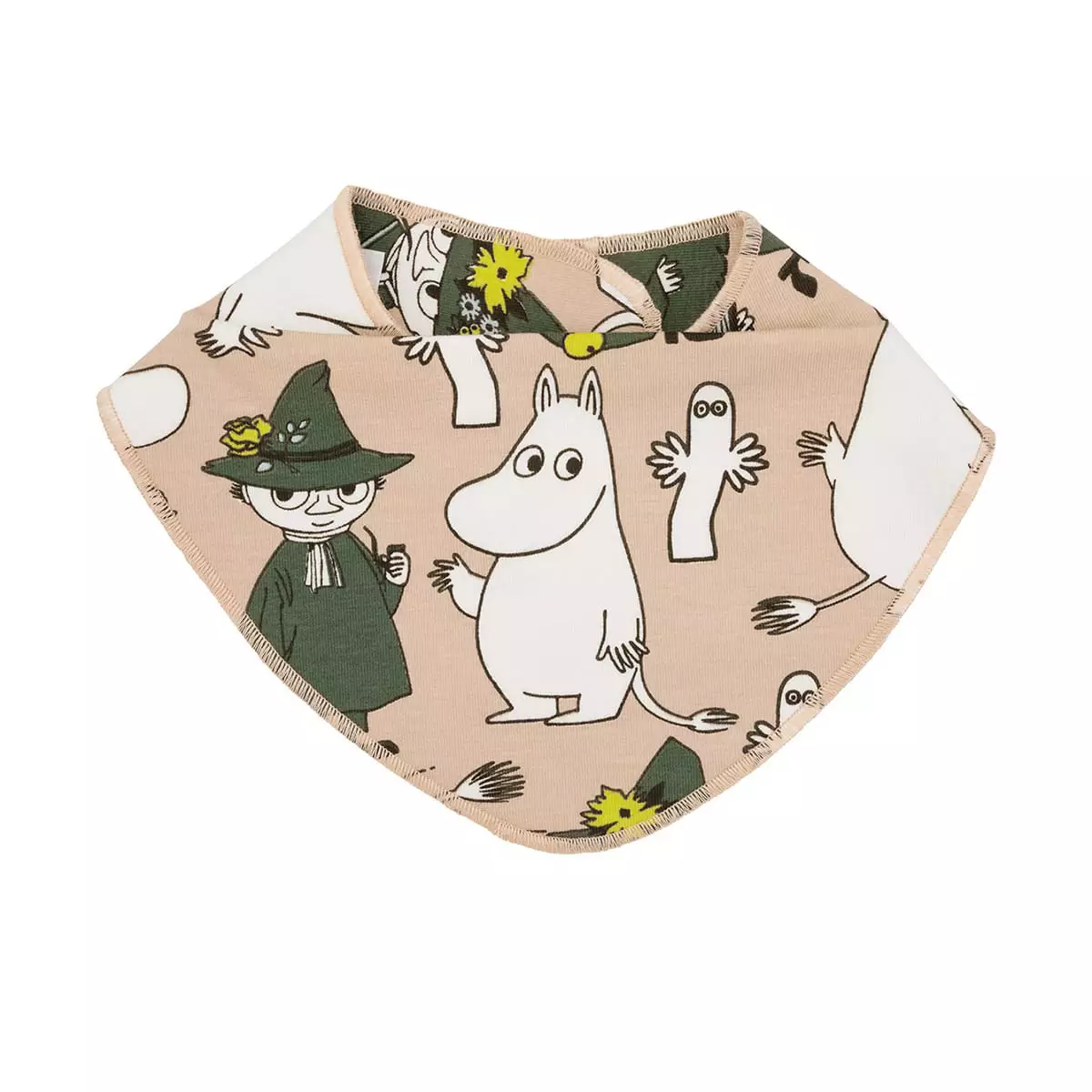 Beige Muumi-huivi kauniilla Kuomat-kuosilla. Käännettävä huivi sopii vauvalle myös kuolalapuksi, nepparikiinnitys.