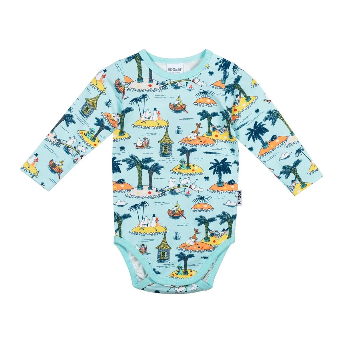 Vaaleansininen Muumi-body, jossa Muumilaakson väki on lähtenyt rantalomalle. Luomupuuvillainen pitkähihainen body.