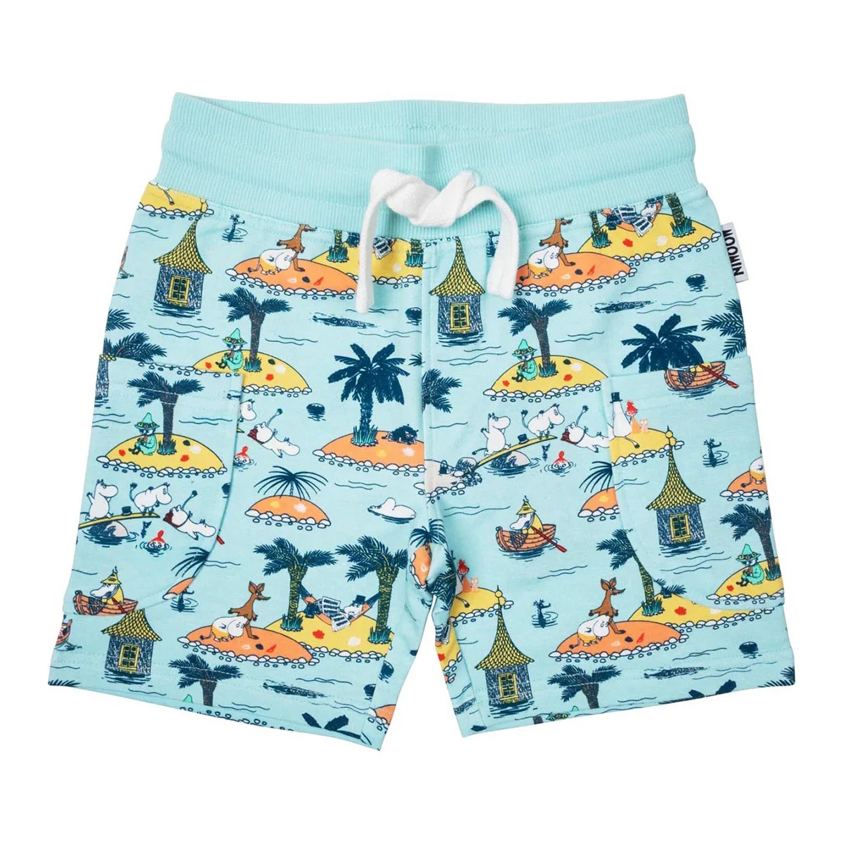 Vaaleansiniset Muumi shortsit, joissa kesäinen Loma-kuosi. Joustava vyötärö kiristysnyöreillä ja sivuilla taskut.