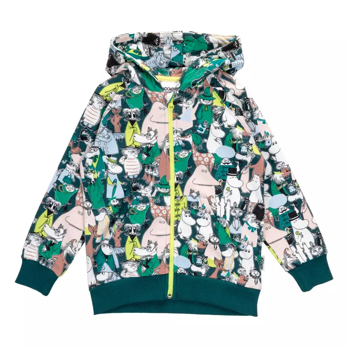Muumi huppari hyväntuulisella Luokkakokous-kuosilla. Pitkä vetoketju, kengurutasku edessä, materiaalina luomupuuvilla.