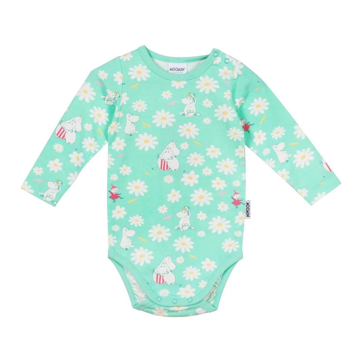Mintunvihreä Muumi-body, jossa kauniita päivänkakkaroita sek' Muumilaakson asukkaita. Luomupuuvillainen pitkähihainen body.