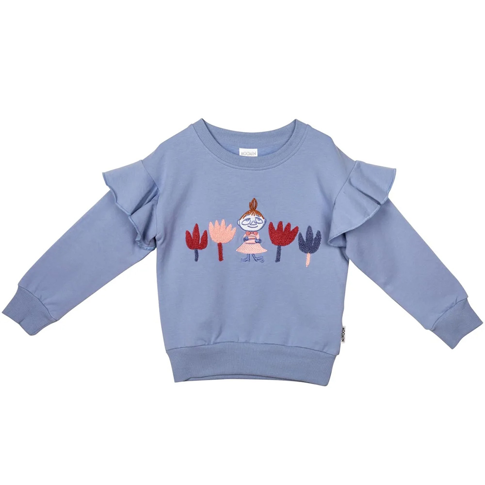 Sininen Muumi collegepaita Pikky Myyn kuvalla. Olkasaumoissa kauniit frillat, rento oversized-malli.