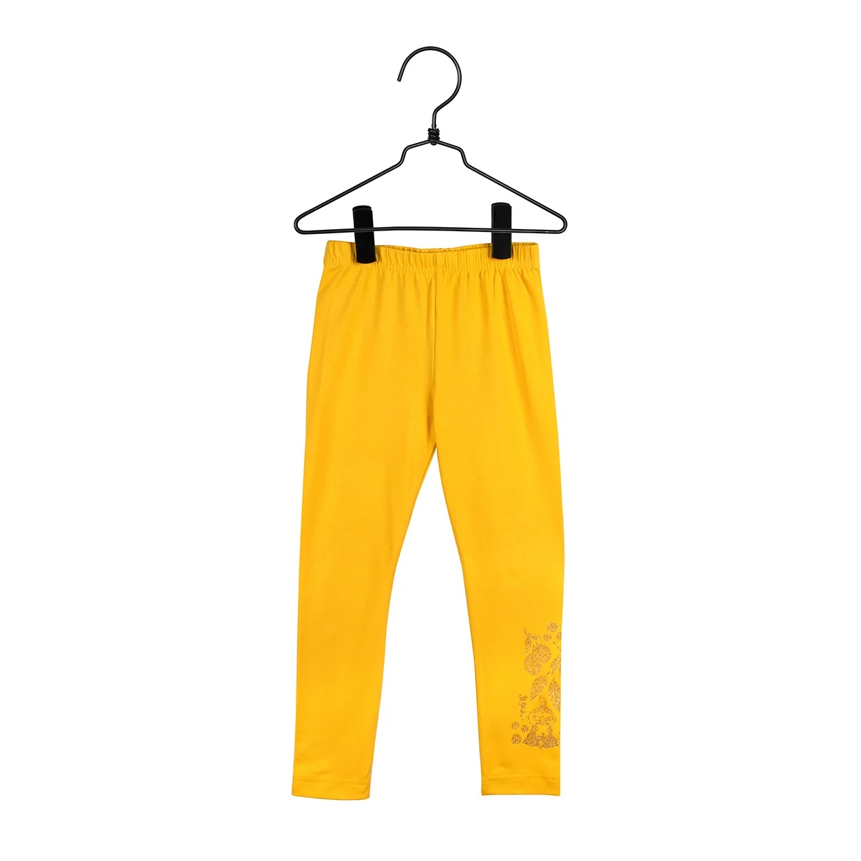 Keltaiset Pikku Myy legginsit, joissa hohtava Pikku Myy printti toisessa lahkeessa. Materiaalina miellyttävän pehmeä puuvillatrikoo.