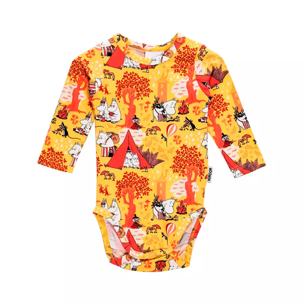 Keltainen Muumi-body, jossa Muumilaakson asukkaat retkeilevät syksyisesä luonnossa. Luomupuuvillainen pitkähihainen body.