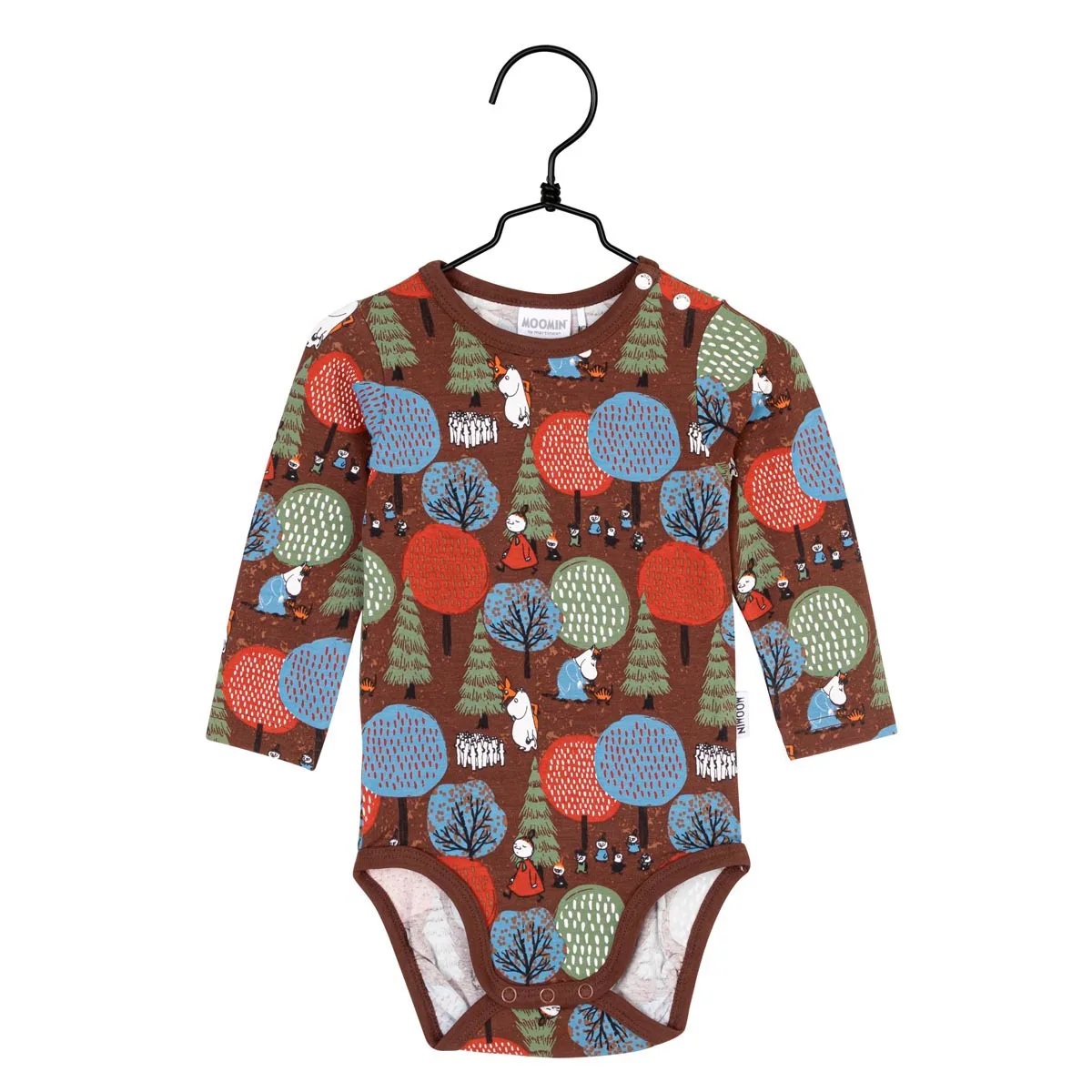 Ruskea Muumi-body vauvalle. Pehmeässä luomupuuvillaisessa bodyssa Muumilaakson väki on retkellä metsän siimeksessä.