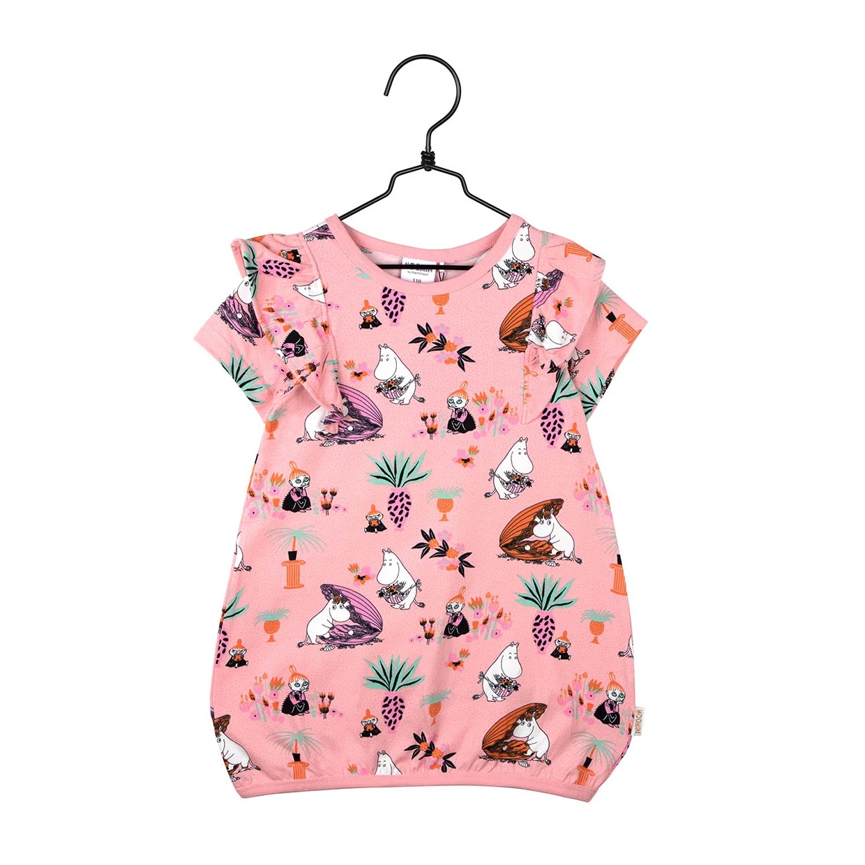 Lyhythihainen Muumi tunika, jossa kivat frillat olkapäillä. Vaaleanpunainen Simpukka-kuosi.