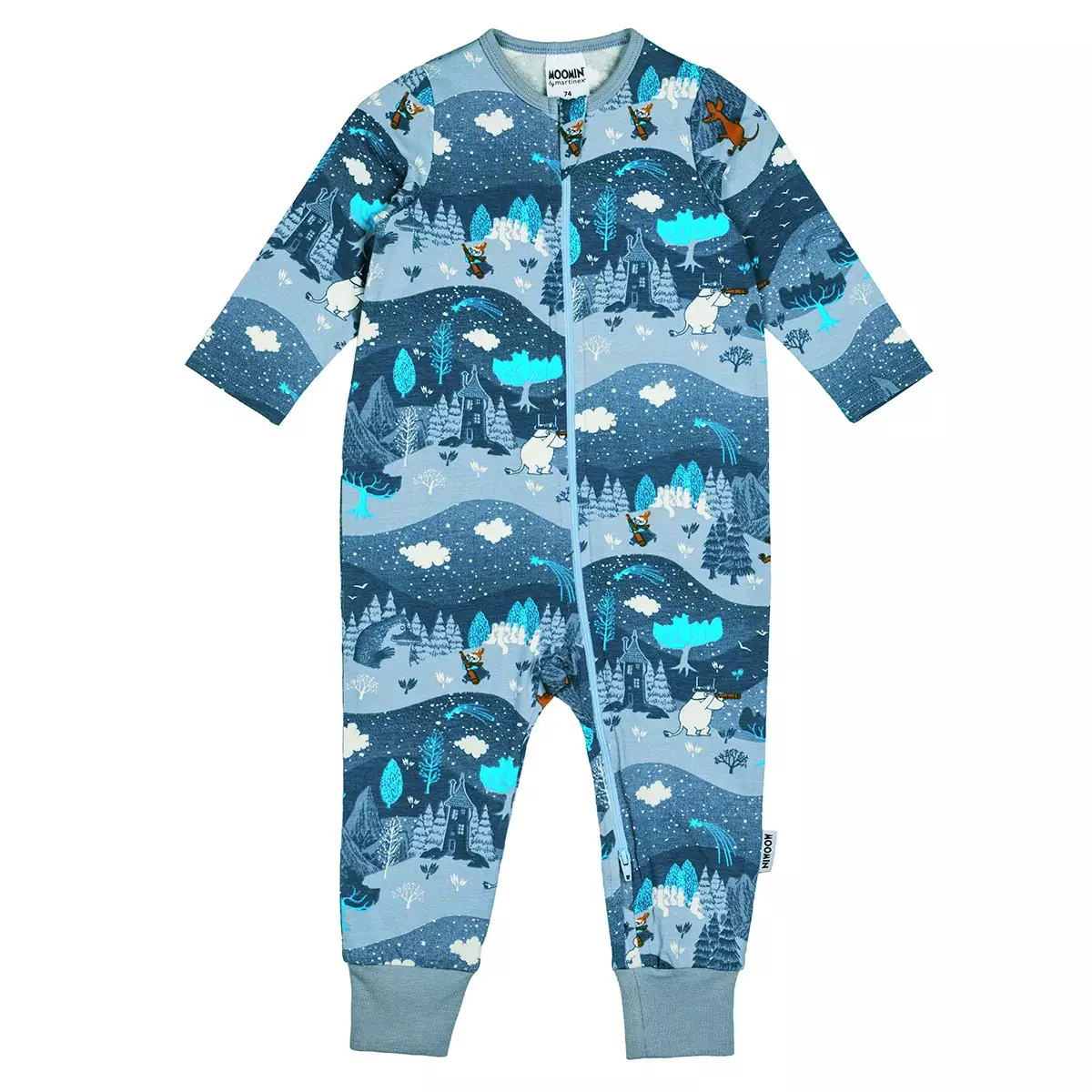 Muumi-pyjama pitkillä lahkeilla ja hihoilla. Pitkä vetoketju helpottaa pukemista. Yöasussa on talvinen hehkuva tähtitaivas-kuosi.
