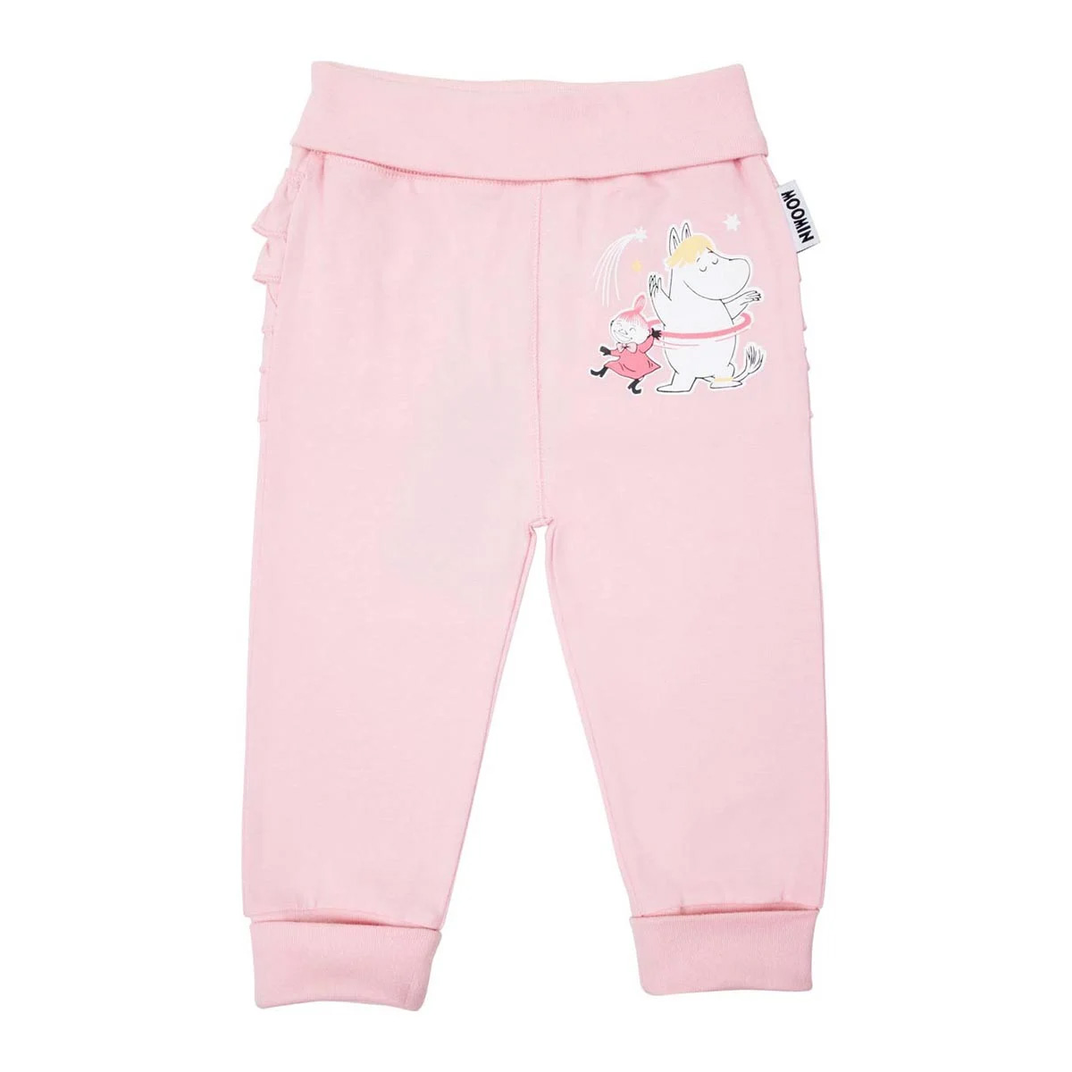 Vaaleanpunaiset Muumi-housut, joissa pepun päällä suloiset frillat. Käännettävät lahkeet ja vyötärö. Pehmeää luomupuuvillatrikoota.