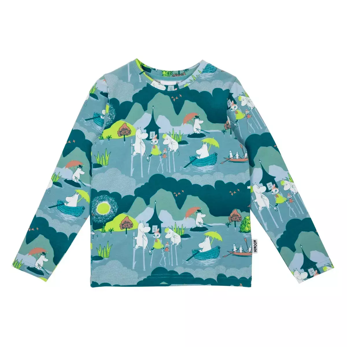 Sininen pitkähihainen Muumi paita, joka on valmistettu pehmeästä luomupuuvillatrikoosta.