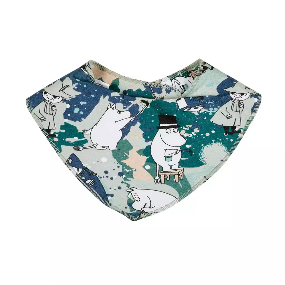 Vihreä Muumi-huivi hauskalla Vesivärit-kuosilla. Käännettävä huivi sopii vauvalle myös kuolalapuksi, nepparikiinnitys.