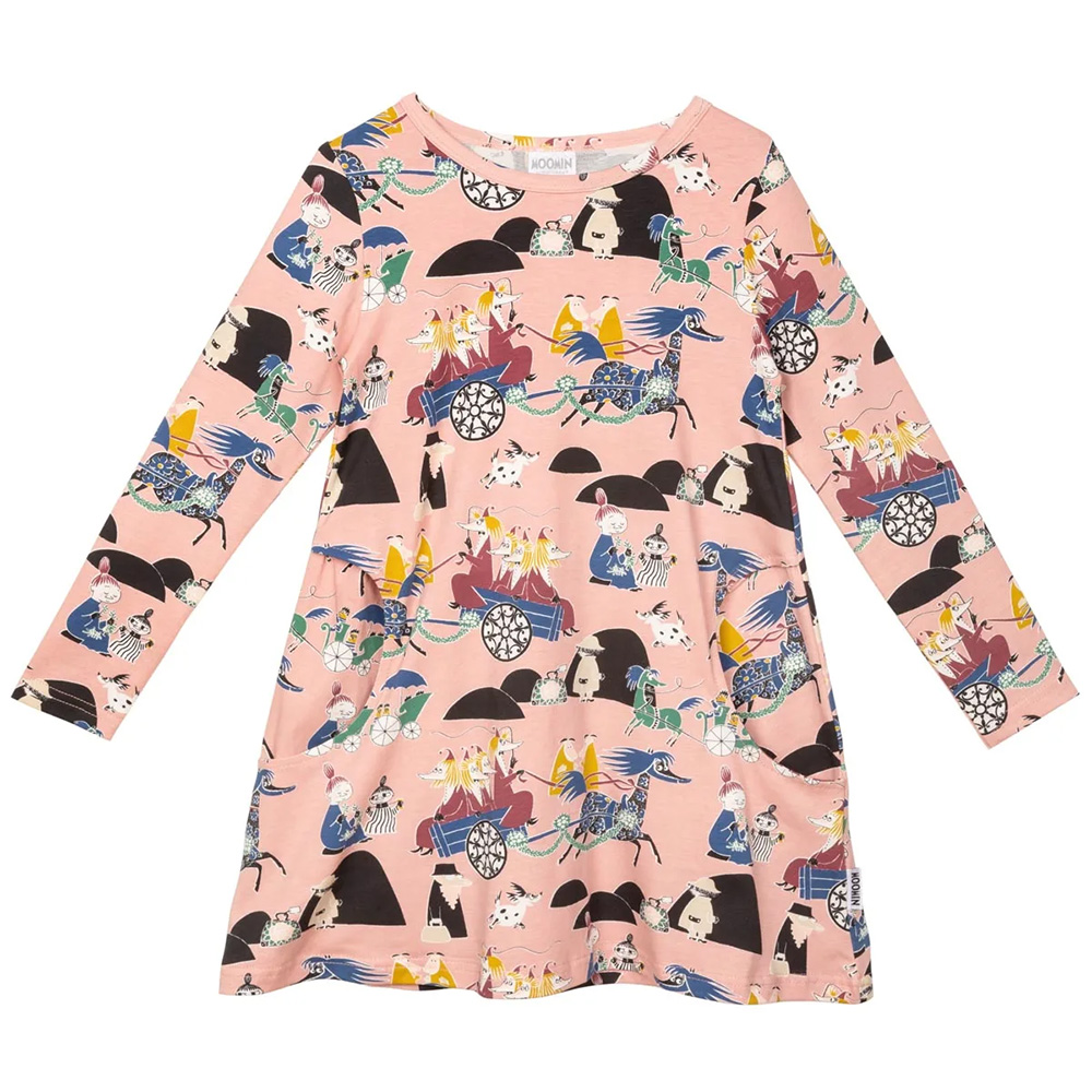 Kaunis A-linjainen Muumi-mekko lapselle. Roosanvärisessä mekossa seikkailee Muumilaakson väkeä.